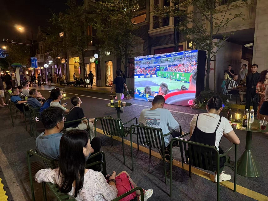 国庆假期晚间,茂名北路限时步行街露天转播上海网球大师赛。