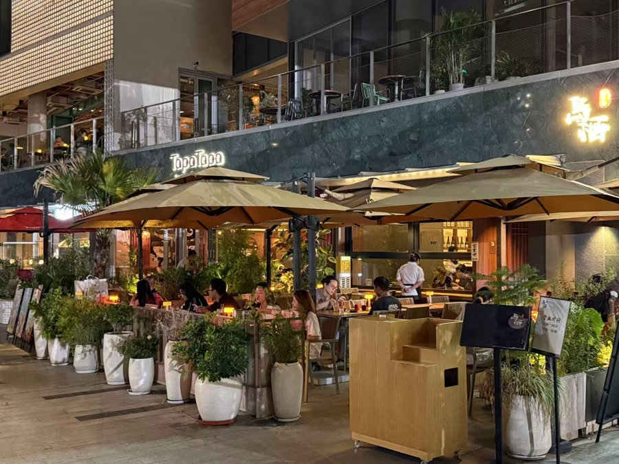 10月2日晚上10点半,西岸梦中心的餐厅外摆位仍有许多客人在用餐。