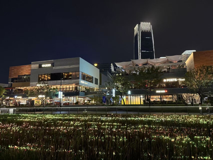 月光下,西岸梦中心的光影装置与商场明亮的灯光交相辉映。