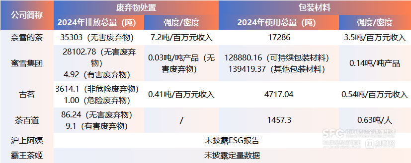 奈雪的茶、蜜雪集团、古茗和茶百道均披露了废弃物处置的定量数据,但仅奈雪的茶未在报告中说明废弃物的类型和统计口径。