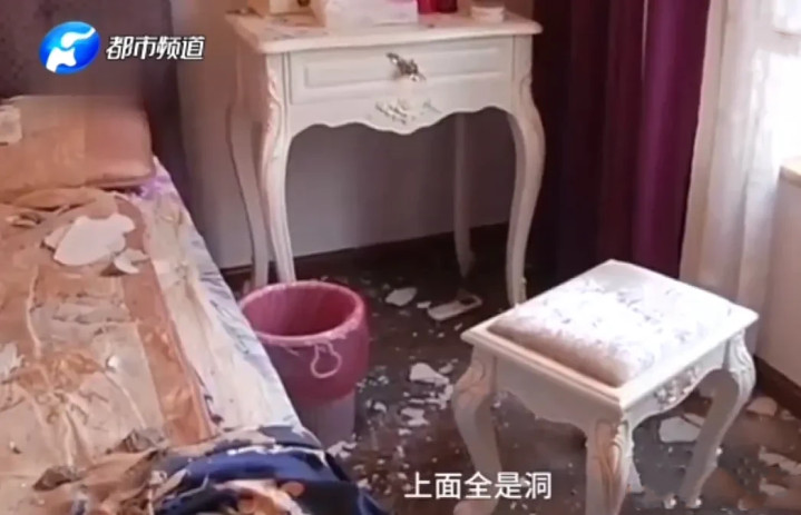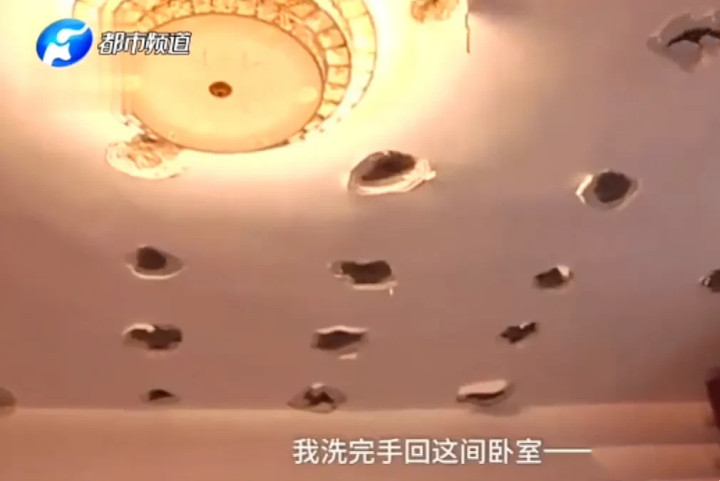 在贵州遵义,易先生遇到了一件极其闹心的事。他为了结婚购置并精心装修了一套新房,入住才一个月,某个工作日回家后,眼前的景象让他目瞪口呆:家里一片狼藉,床上、地板、家具上到处散落着混凝土碎块、石膏板和厚厚的粉尘。抬头一看,天花板竟布满了密密麻麻的窟窿,仔细数下来,足有六十多个。